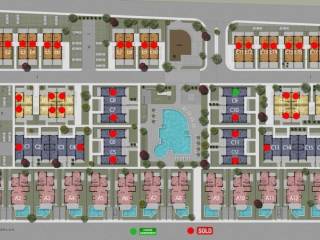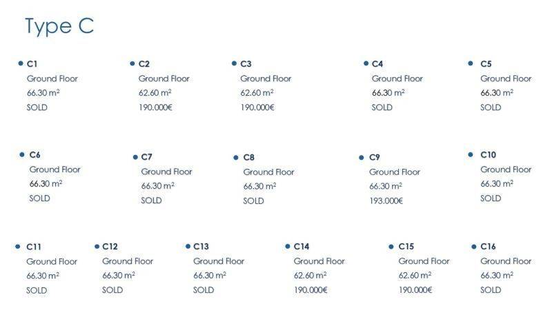 • C: 16 Διαμερίσματα ισογείου από 62,6 τ.μ. έως 66,3 τ.μ. που αποτελούνται από σαλοκουζίνα, 2 υπνοδωμάτια, 1 μπάνιο.
