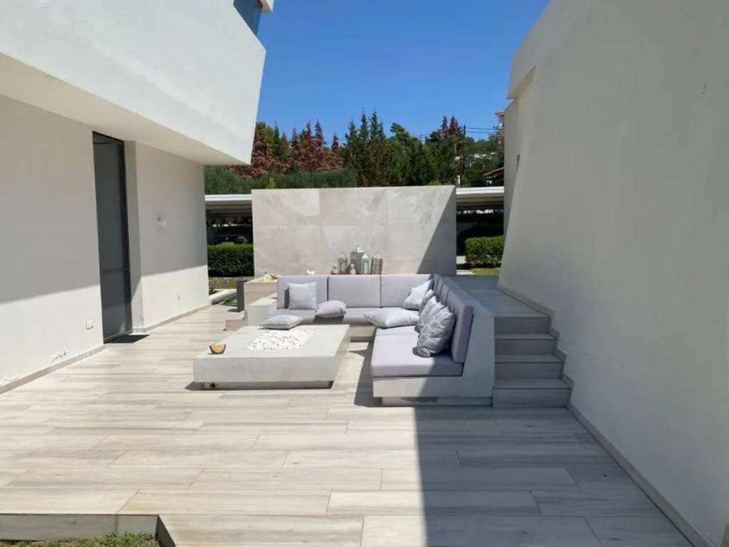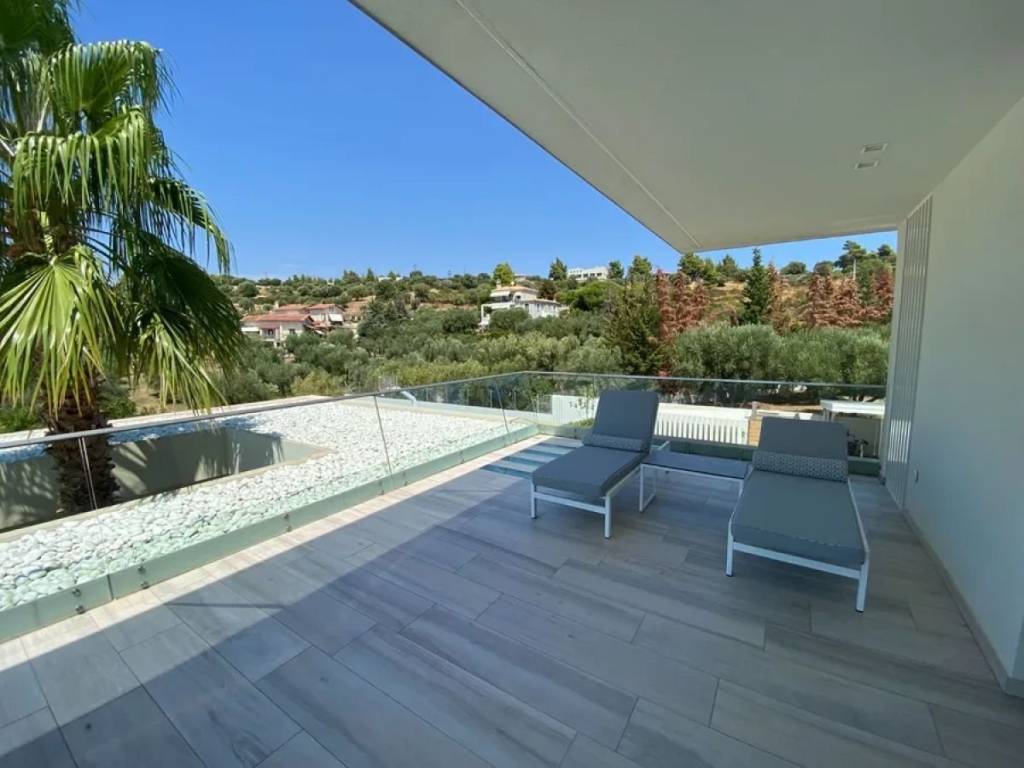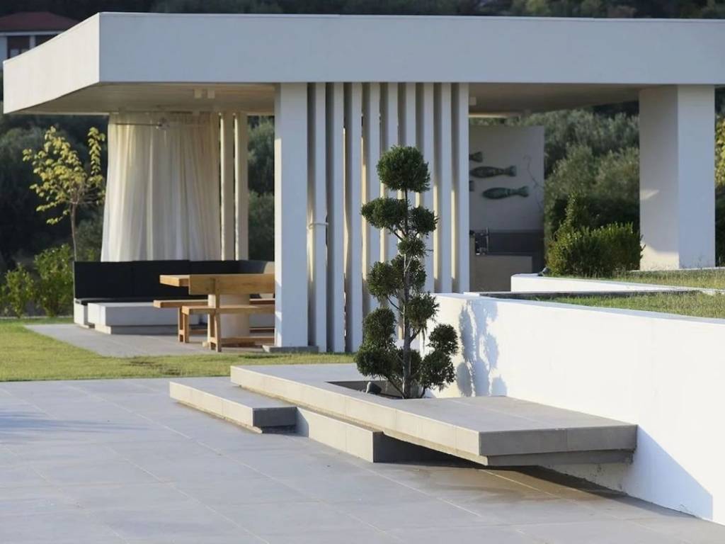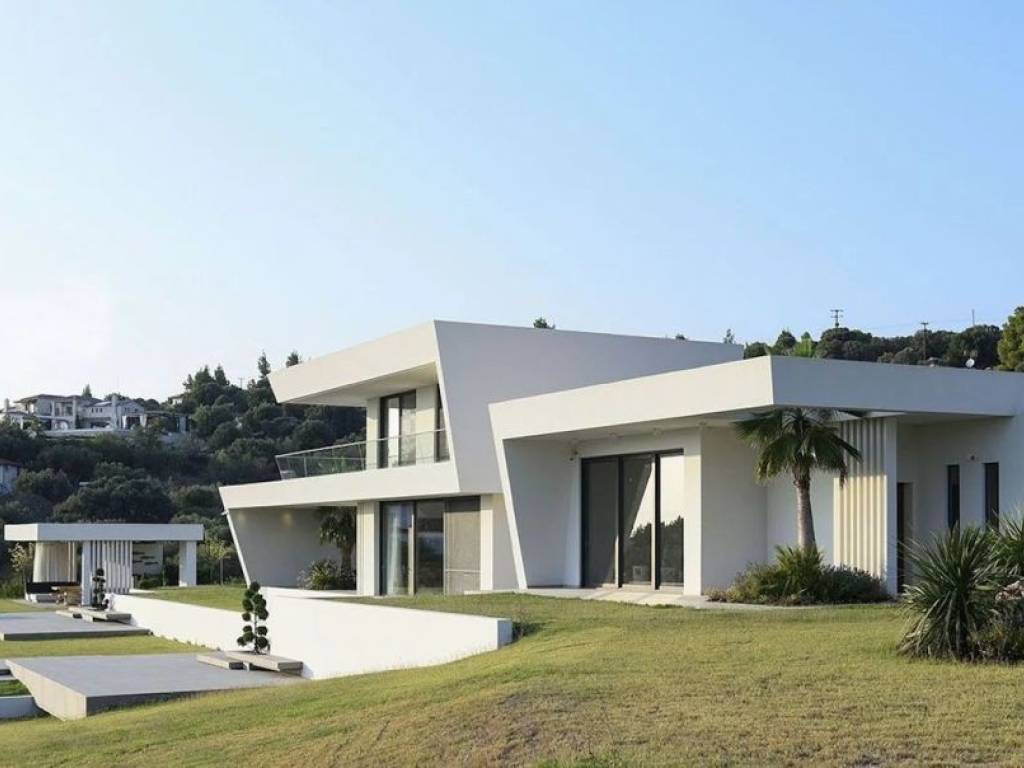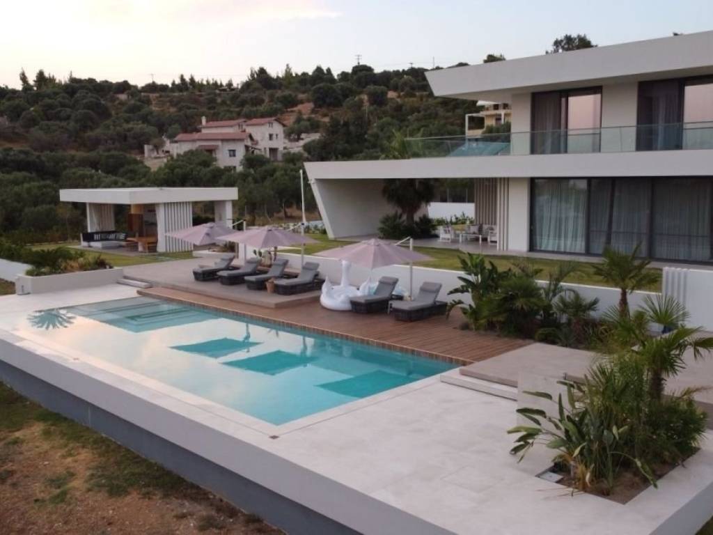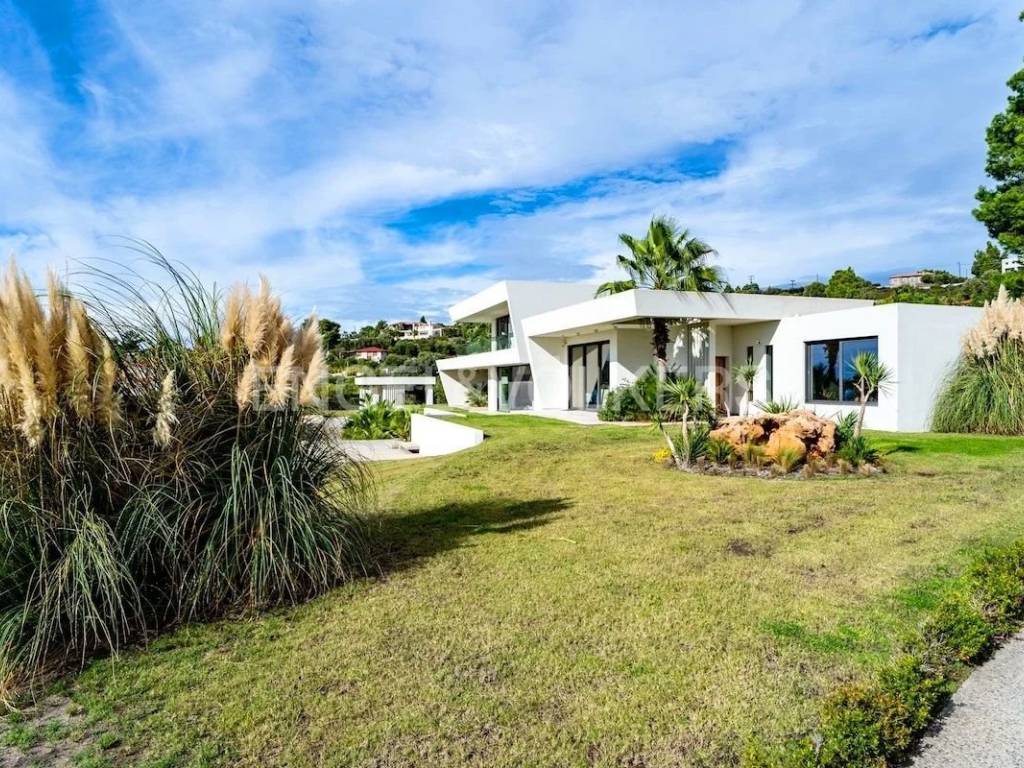 A unique villa, a fine example of contemporary architecture, located in a picturesque area near Nikiti, Sithonia, Halkidiki, just a few minutes from the endless sea. Every space of the residence is designed for unforgettable moments. On a spacious plot of 4000 sq.m. there are two buildings. The main building has three levels: entering the villa, we find ourselves in a masterfully designed living area with a kitchen and dining area, from where an unobstructed panoramic view opens up. The interior architecture harmoniously complements the exterior, thanks to special designs and architectural elements. On the lower level there is a room with a toilet, a laundry room and a storage room. On the upper level there are two spacious bedrooms with panoramic views and a bathroom. The design of the bathroom is particularly original. The external terrace of this floor with glass railings, reflecting the design of the main building, and skillfully integrated palm trees on all levels creates a truly impressive impact. The second building has two levels: the lower level has two bedrooms with en-suite bathrooms and a storage room; the upper level, overlooking the garden, has a living room with a kitchen, two master bedrooms with en-suite bathrooms.