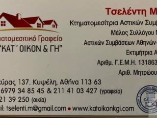 REAL ESTATE ΚΑΤ΄ΟΙΚΟΝ & ΓΗ ΜΑΡΙΑ ΤΣΕΛΕΝΤΗ Our Office operates in the wider region of ATTICA focusing especially on the areas of Galatsi - Labrini - Gizi - Patisia - Kipriadou - Kipseli - Poligono - Perisos - Alsoupoli - Halandri . Having experience and showing professionalism in Real Estate, the manager and the experienced partners of KAT OIKON & GI provide our Services in friendly and Human centered environment focusing on the individual needs and expectations of our clients . As mempers of the Realtor Association of Athens we can guarantee your successful sale or Rental of your Property . For any Information contact us on phone numpers 210 2139250 - 2114103427 & 6979348545 , or visit us in our Office at KERKIRAS 137 , KIPSELI . We cooperate with experts on Legal , Notary , Topographic , Tax , Insurance matters and Technicians , advise us on repairs and renovations. OUR ADVANTAGES : Commitment Trust Professionalism Confidentiality Ethics